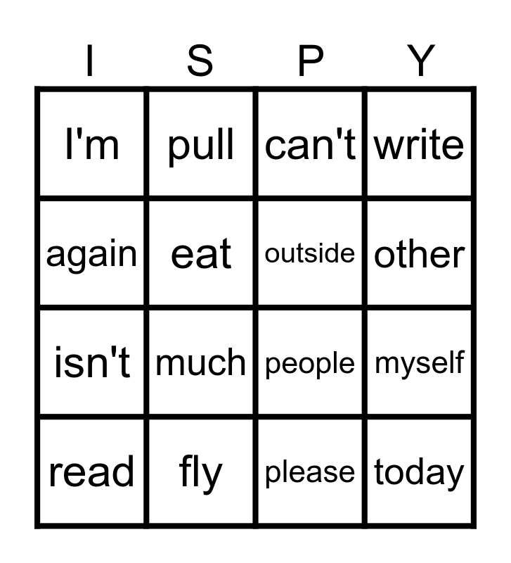 This bingo card has 16 words: fly, myself, can't, I'm, isn't, pull, people, please, again, eat, read, write, much, other, outside and today.