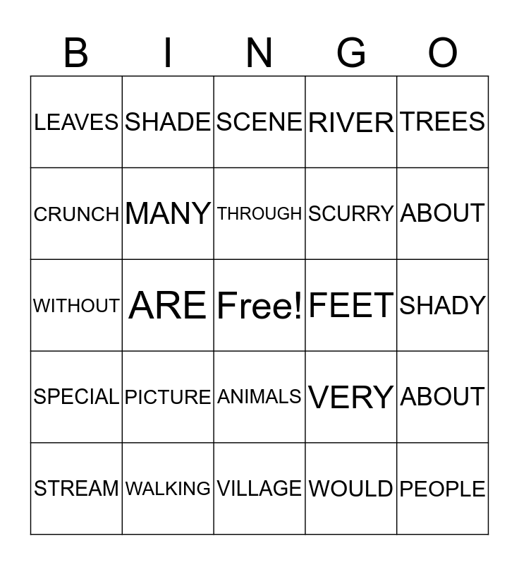 This bingo card has a free space and 24 words: PICTURE, WALKING, THROUGH, STREAM, TREES, LEAVES, CRUNCH, SHADE, FEET, ANIMALS, SCURRY, WITHOUT, VERY, ABOUT, MANY, WOULD, SHADY, SCENE, ABOUT, ARE, PEOPLE, SPECIAL, RIVER and VILLAGE.
