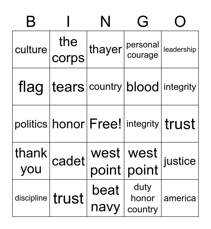 This bingo card has a free space and 44 words: freedom, america, flag, discipline, culture, duty honor country, thayer, the corps, leadership, trust, personal courage, integrity, west point, cadet, go army, beat navy, freedom, politics, personal courage, integrity, the corps, duty, honor, country, discipline, culture, leadership, trust, america, go army, west point, thank you, uniform, justice, hardwork, thayer, honor, duty, cadet, privilege, country, flag, blood, sweat, tears and fair trade.