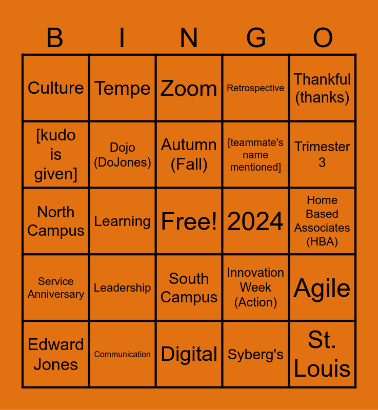 This bingo card has a free space and 36 words: Change, Reorg, Coaching (coach), Dojo (DoJones), Innovation Week (Action), Service Anniversary, Autumn (Fall), Frank, Thankful (thanks), Happy, Learning, Retrospective, Feedback, 2024, Trimester 3, Culture, Engagement, Leadership, St. Louis, Zoom, Home Based Associates (HBA), Agile, Communication, Edward Jones, Digital, Tempe, North Campus, Retirement, [teammate's name mentioned], [kudo is given], [new associate introduction], [someone laughs], Syberg's, South Campus, Mural and Pumpkin.