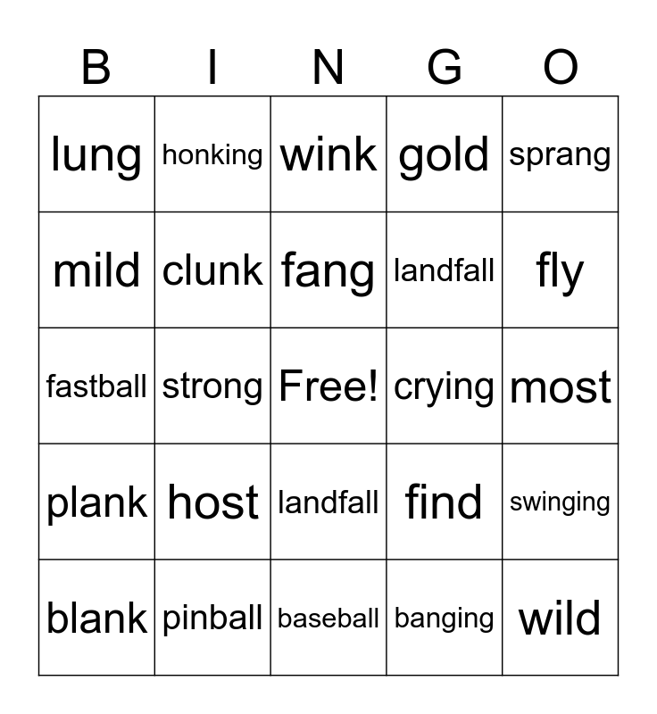 This bingo card has a free space and 24 words: host, pinball, fang, blank, sprang, lung, mild, honking, crying, landfall, landfall, fastball, find, swinging, clunk, banging, most, wink, fly, strong, wild, plank, gold and baseball.