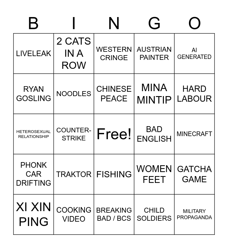 This bingo card has a free space and 24 words: TRAKTOR, COOKING VIDEO, CHINESE PEACE, XI XIN PING, AI GENERATED, LIVELEAK, RYAN GOSLING, 2 CATS IN A ROW, BAD ENGLISH, FISHING, MINA MINTIP, HETEROSEXUAL RELATIONSHIP, WOMEN FEET, GATCHA GAME, NOODLES, CHILD SOLDIERS, MINECRAFT, WESTERN CRINGE, HARD LABOUR, COUNTER-STRIKE, MILITARY PROPAGANDA, PHONK CAR DRIFTING, AUSTRIAN PAINTER and BREAKING BAD / BCS.