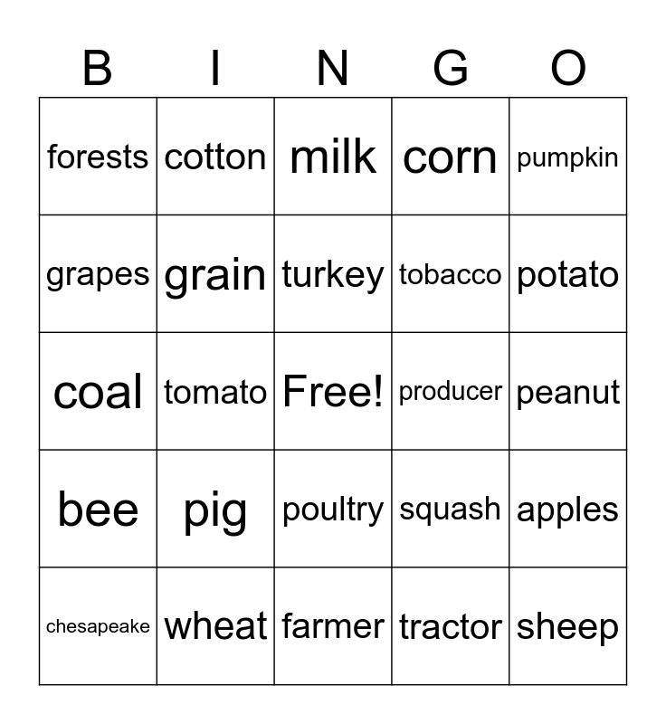 This bingo card has a free space and 24 words: pig, wheat, turkey, chesapeake, pumpkin, forests, grapes, cotton, producer, poultry, tobacco, coal, squash, apples, grain, tractor, peanut, milk, potato, tomato, sheep, bee, corn and farmer.