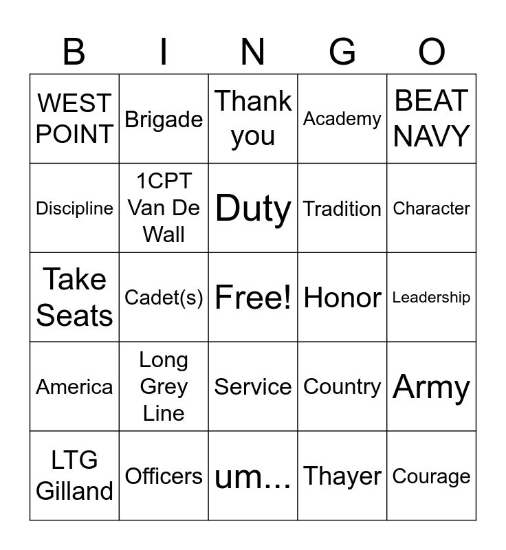 This bingo card has a free space and 24 words: LTG Gilland, Long Grey Line, Duty, Thayer, BEAT NAVY, WEST POINT, Brigade, Thank you, Honor, Leadership, Take Seats, 1CPT Van De Wall, Country, Army, Discipline, Officers, um..., Academy, Character, America, Cadet(s), Service, Tradition and Courage.