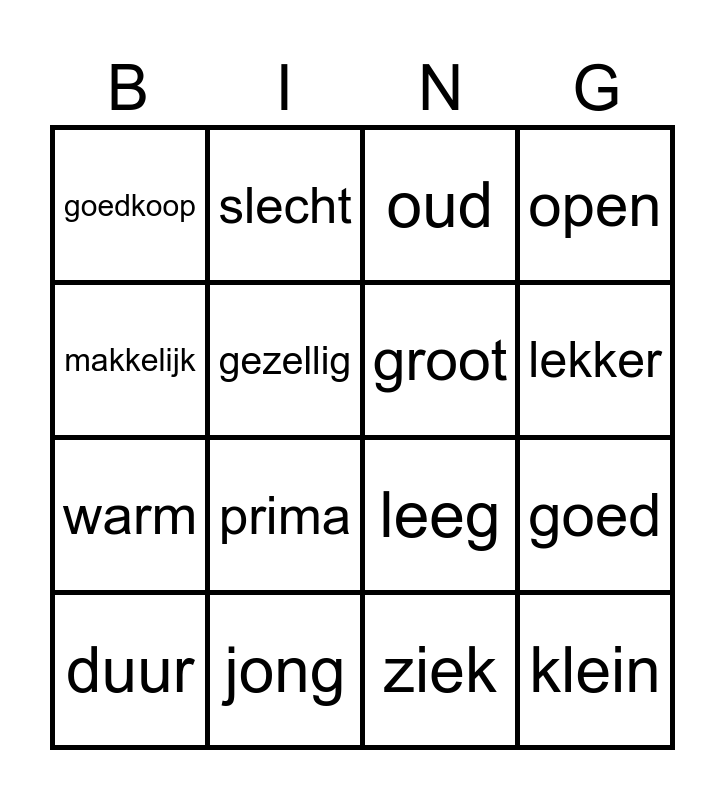 This bingo card has 23 words: heerlijk, leuk, leeg, klein, warm, slecht, oud, open, duur, jong, ziek, lekker, vervelend, vaak, nieuw, koud, goedkoop, gezellig, groot, goed, makkelijk, prima and mooi.