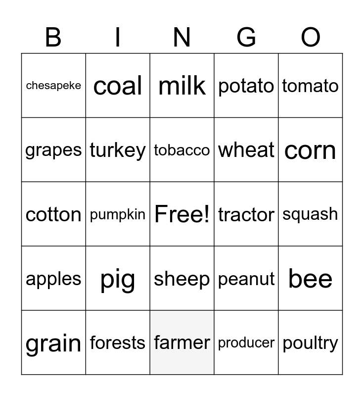 This bingo card has a free space and 24 words: pig, forests, tobacco, grain, tomato, chesapeke, grapes, coal, tractor, sheep, wheat, cotton, peanut, bee, turkey, producer, squash, milk, corn, pumpkin, poultry, apples, potato and farmer.