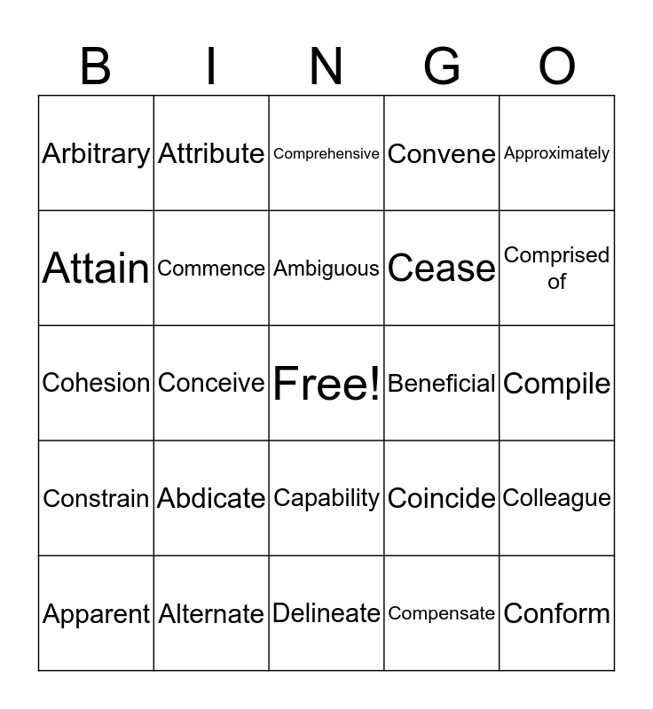 This bingo card has a free space and 24 words: Abdicate, Alternate, Ambiguous, Apparent, Approximately, Arbitrary, Attain, Attribute, Beneficial, Capability, Cease, Cohesion, Coincide, Colleague, Commence, Compensate, Compile, Comprehensive, Comprised of, Conceive, Conform, Constrain, Convene and Delineate.