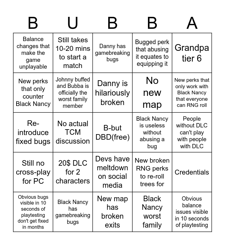 This bingo card has a free space and 24 words: 20$ DLC for 2 characters, Black Nancy has gamebreaking bugs, Danny is hilariously broken, Obvious bugs visible in 10 seconds of playtesting don't get fixed in months, Grandpa tier 6, Balance changes that make the game unplayable, New perks that only counter Black Nancy, Still takes 10-20 mins to start a match, Black Nancy is useless without abusing a bug, Devs have meltdown on social media, No new map, Re-introduce fixed bugs, New broken RNG perks to re-roll trees for, Credentials, Johnny buffed and Bubba is officially the worst family member, Black Nancy worst family, People without DLC can't play with people with DLC, Danny has gamebreaking bugs, New perks that only work with Black Nancy that everyone can RNG roll, No actual TCM discussion, Obvious balance issues visible in 10 seconds of playtesting, Still no cross-play for PC, Bugged perk that abusing it equates to equipping it and New map has broken exits.