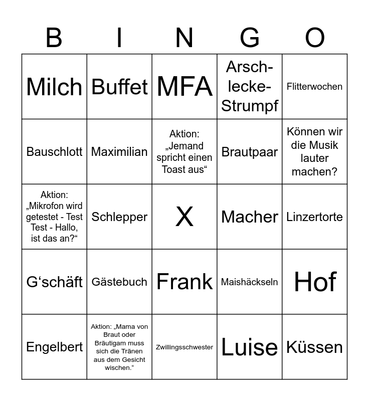 This bingo card has a free space and 31 words: Zwillingsschwester, Trauzeuge/in, Schlepper, Moving Head, Milch, MFA, Maximilian, Maishäckseln, Macher, Luise, Linzertorte, Küssen, Kuh, Kroketten, Können wir die Musik lauter machen?, Kaba, Hof, Gästebuch, G‘schäft, Frank, Flitterwochen, Fendt, Engelbert, Buffet, Brautpaar, Bauschlott, Arsch-lecke-Strumpf, Aktion: „Mikrofon wird getestet - Test Test - Hallo, ist das an?“, Aktion: „Mama von Braut oder Bräutigam muss sich die Tränen aus dem Gesicht wischen.“, Aktion: „Jemand spricht einen Toast aus“ and Aktion: „Anschneiden der Torte“.
