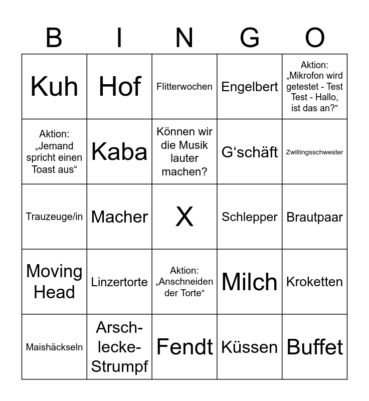 This bingo card has a free space and 31 words: Fendt, Frank, Macher, MFA, Kuh, Flitterwochen, Kaba, Milch, Schlepper, Küssen, Brautpaar, Buffet, Maximilian, Luise, Zwillingsschwester, Bauschlott, Kroketten, Linzertorte, Moving Head, Aktion: „Anschneiden der Torte“, Aktion: „Mikrofon wird getestet - Test Test - Hallo, ist das an?“, Aktion: „Mama von Braut oder Bräutigam muss sich die Tränen aus dem Gesicht wischen.“, Maishäckseln, Hof, G‘schäft, Aktion: „Jemand spricht einen Toast aus“, Engelbert, Trauzeuge/in, Arsch-lecke-Strumpf, Können wir die Musik lauter machen? and Gästebuch.