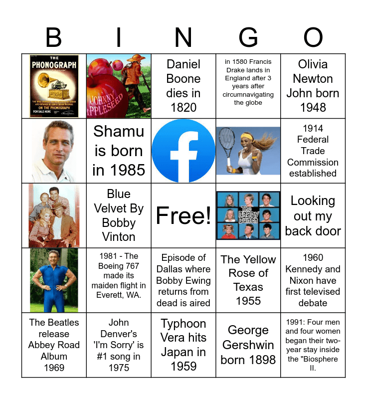 This bingo card has 9 images, a free space and 19 words: 1960 Kennedy and Nixon have first televised debate, Poet TS Eliot is Born in 1988, George Gershwin born 1898, Daniel Boone dies in 1820, The Beatles release Abbey Road Album 1969, in 1580 Francis Drake lands in England after 3 years after circumnavigating the globe, John Denver's 'I'm Sorry' is #1 song in 1975, Typhoon Vera hits Japan in 1959, 1914 Federal Trade Commission established, 1981 - The Boeing 767 made its maiden flight in Everett, WA., Shamu is born in 1985, Episode of Dallas where Bobby Ewing returns from dead is aired, Philadelphia was occupied by British troops, 1991: Four men and four women began their two-year stay inside the "Biosphere II., Blue Velvet By Bobby Vinton, Looking out my back door, The Yellow Rose of Texas 1955, Olivia Newton John born 1948 and Melissa Sue Anderson born 1962.