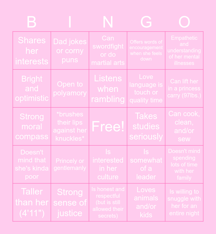 This bingo card has a free space and 24 words: Princely or gentlemanly, Strong sense of justice, Listens when rambling, Taller than her (4'11"), Empathetic and understanding of her mental illnesses, Shares her interests, Bright and optimistic, Dad jokes or corny puns, Takes studies seriously, Is interested in her culture, Love language is touch or quality time, Strong moral compass, Is somewhat of a leader, Doesn't mind spending lots of time with her family, Open to polyamory, Loves animals and/or kids, Can cook, clean, and/or sew, Can swordfight or do martial arts, Can lift her in a princess carry (97lbs.), *brushes their lips against her knuckles*, Is willing to snuggle with her for an entire night, Doesn't mind that she's kinda poor, Offers words of encouragement when she feels down and Is honest and respectful (but is still allowed their secrets).