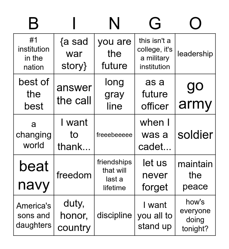 This bingo card has a free space and 24 words: freedom, duty, honor, country, long gray line, America's sons and daughters, leadership, #1 institution in the nation, best of the best, {a sad war story}, when I was a cadet..., friendships that will last a lifetime, as a future officer, a changing world, let us never forget, maintain the peace, answer the call, I want you all to stand up, soldier, you are the future, go army, I want to thank..., how's everyone doing tonight?, beat navy, this isn't a college, it's a military institution and discipline.