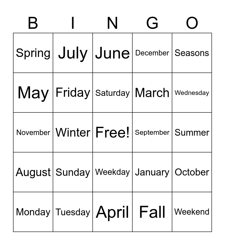 This bingo card has a free space and 27 words: January, February, March, April, May, June, July, August, September, October, November, December, Monday, Tuesday, Wednesday, Thursday, Friday, Saturday, Sunday, Spring, Summer, Fall, Winter, Weekend, Weekday, Seasons and Days.