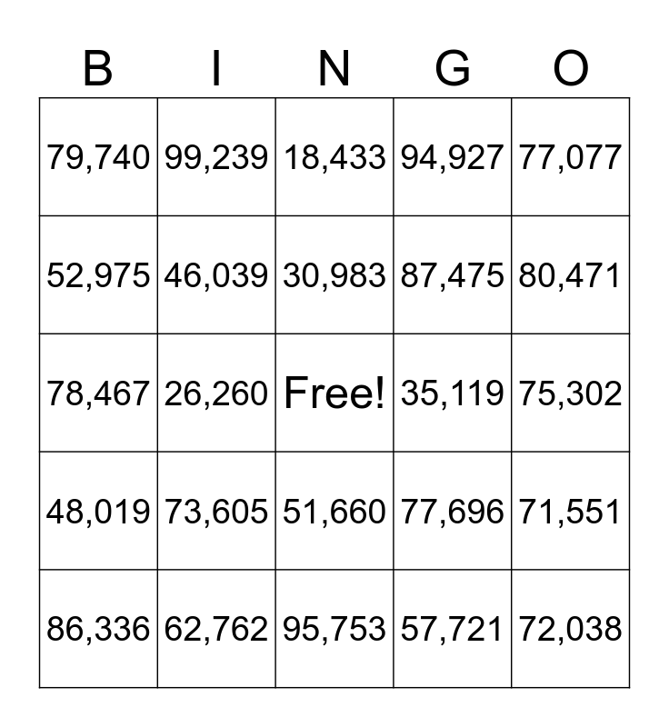 This bingo card has a free space and 71 words: 99,804, 99,239, 97,074, 96,316, 95,753, 95,141, 94,927, 91,881, 87,475, 86,550, 86,336, 84,268, 80,471, 79,740, 78,988, 78,467, 77,696, 77,077, 75,343, 75,302, 73,605, 72,038, 71,551, 69,709, 67,395, 66,833, 65,977, 64,559, 64,016, 62,849, 62,762, 62,341, 60,523, 58,689, 57,721, 57,673, 56,812, 53,764, 52,975, 52,005, 51,660, 48,257, 48,019, 48,016, 47,298, 47,071, 46,511, 46,039, 43,140, 39,209, 38,971, 38,036, 35,119, 34,890, 34,755, 31,773, 30,983, 30,206, 27,399, 27,368, 26,691, 26,530, 26,260, 26,068, 23,839, 18,479, 18,433, 17,867, 16,049, 13,164 and 12,000.