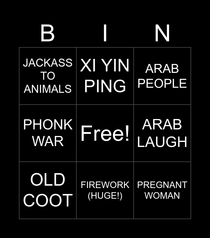 This bingo card has a free space and 8 words: ARAB LAUGH, ARAB PEOPLE, XI YIN PING, OLD COOT, JACKASS TO ANIMALS, PREGNANT WOMAN, PHONK WAR and FIREWORK (HUGE!).