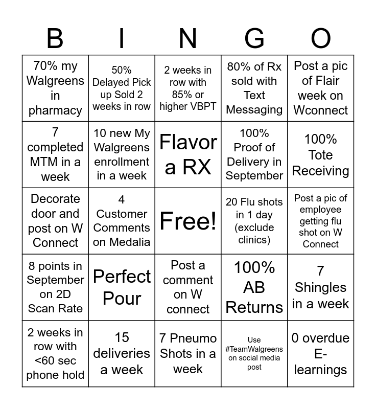 This bingo card has a free space and 24 words: Perfect Pour, 15 deliveries a week, Flavor a RX, 2 weeks in row with <60 sec phone hold, Post a pic of Flair week on Wconnect, 70% my Walgreens in pharmacy, 7 completed MTM in a week, 50% Delayed Pick up Sold 2 weeks in row, 20 Flu shots in 1 day (exclude clinics), Post a comment on W connect, 100% Proof of Delivery in September, Decorate door and post on W Connect, 100% AB Returns, 7 Shingles in a week, 10 new My Walgreens enrollment in a week, Use #TeamWalgreens on social media post, Post a pic of employee getting flu shot on W Connect, 2 weeks in row with 85% or higher VBPT, 100% Tote Receiving, 4 Customer Comments on Medalia, 0 overdue E-learnings, 8 points in September on 2D Scan Rate, 80% of Rx sold with Text Messaging and 7 Pneumo Shots in a week.