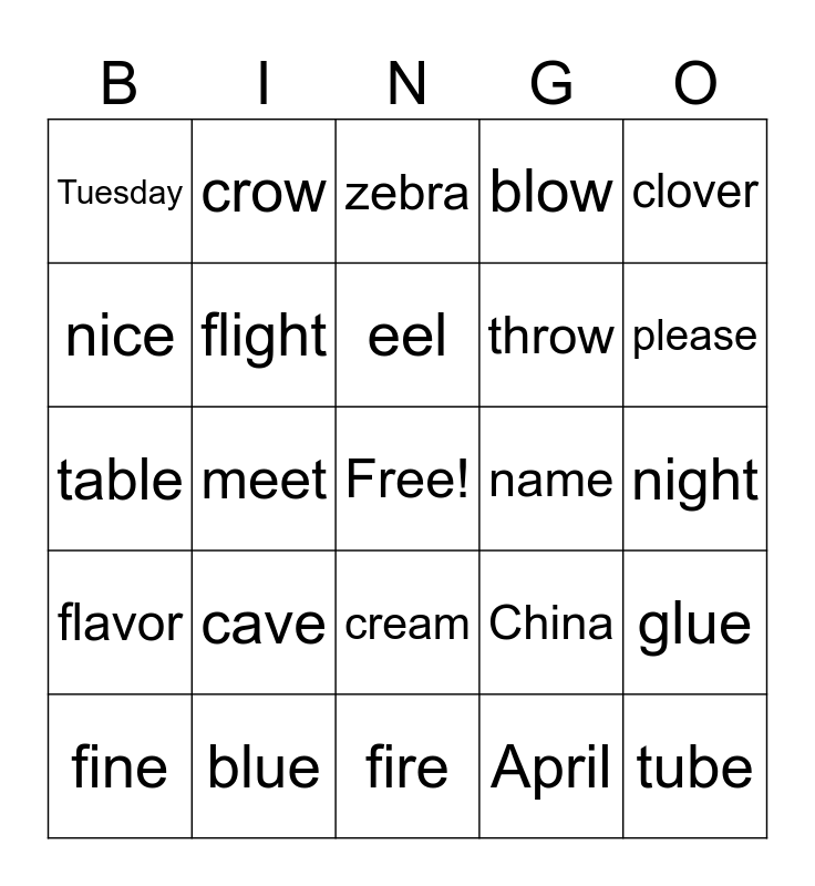 This bingo card has a free space and 24 words: cave, blue, eel, fine, clover, Tuesday, nice, crow, name, cream, throw, table, China, glue, flight, April, night, zebra, please, meet, tube, flavor, blow and fire.