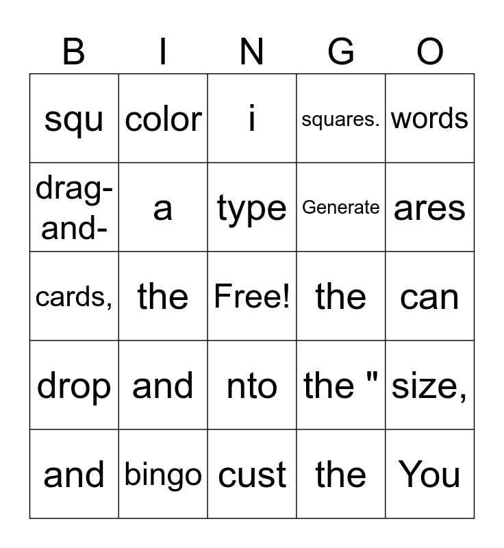 This bingo card has a free space and 37 words: title,, cho, ose, a, size,, and, type, your, words, into, the, squares., You, can, drag-and-, drop, images, i, nto, the, squ, ares, and, cust, omize, the, color, scheme., To, generate, your, bingo, cards,, cilck, the ", Generate and " button..