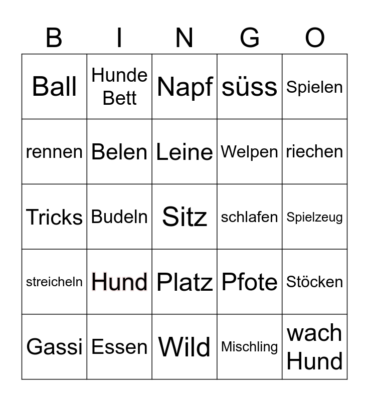 This bingo card has a free space and 24 words: Hund, Essen, Leine, Gassi, Spielen, Ball, rennen, Hunde Bett, schlafen, Platz, Welpen, Tricks, Pfote, Stöcken, Belen, Mischling, Spielzeug, Napf, riechen, Budeln, wach Hund, streicheln, süss and Wild.