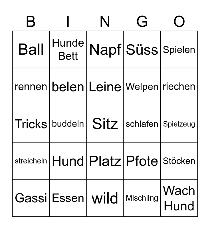 This bingo card has a free space and 24 words: Hund, Essen, Leine, Gassi, Spielen, Ball, rennen, Hunde Bett, schlafen, Platz, Welpen, Tricks, Pfote, Stöcken, belen, Mischling, Spielzeug, Napf, riechen, buddeln, Wach Hund, streicheln, Süss and wild.