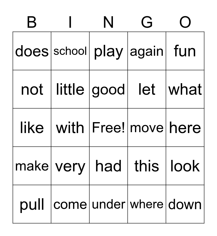 This bingo card has a free space and 24 words: very, come, good, pull, fun, does, not, school, move, had, let, like, this, look, little, where, here, play, what, with, down, make, again and under.