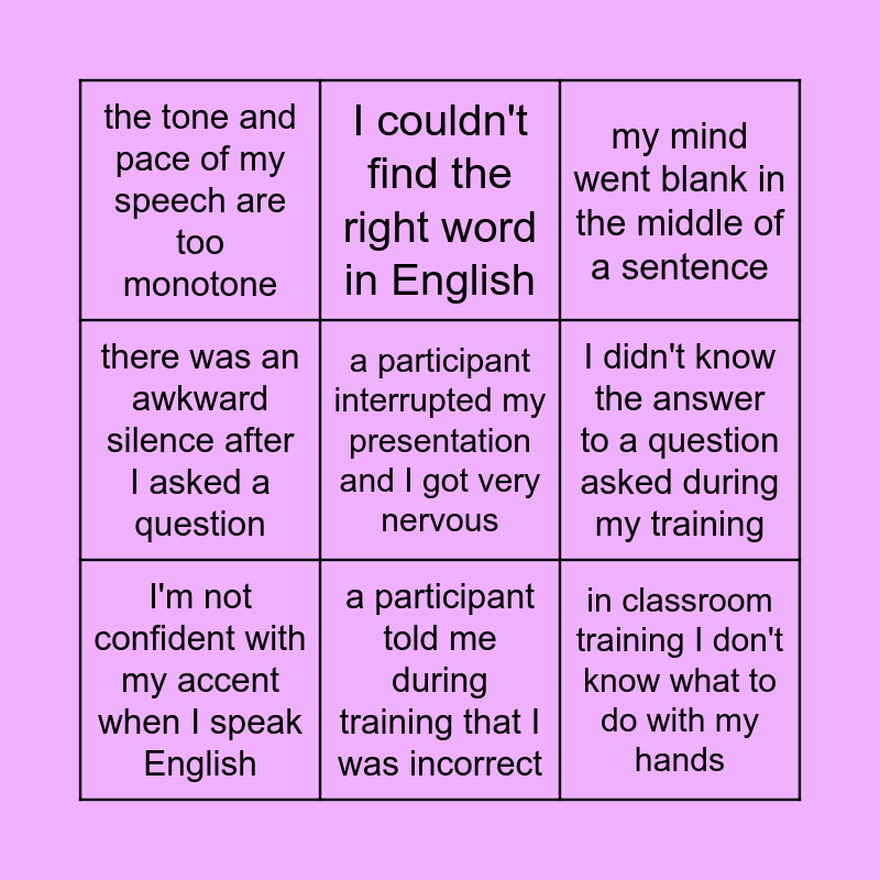 This bingo card has a free space and 8 words: I didn't know the answer to a question asked during my training, my mind went blank in the middle of a sentence, I couldn't find the right word in English, I'm not confident with my accent when I speak English, the tone and pace of my speech are too monotone, in classroom training I don't know what to do with my hands, there was an awkward silence after I asked a question and a participant told me during training that I was incorrect.