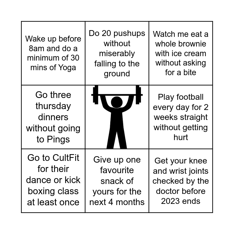 This bingo card has a free space and 8 words: Go three thursday dinners without going to Pings, Do 20 pushups without miserably falling to the ground, Play football every day for 2 weeks straight without getting hurt, Go to CultFit for their dance or kick boxing class at least once, Watch me eat a whole brownie with ice cream without asking for a bite, Wake up before 8am and do a minimum of 30 mins of Yoga, Give up one favourite snack of yours for the next 4 months and Get your knee and wrist joints checked by the doctor before 2023 ends.