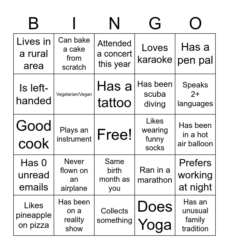 This bingo card has a free space and 44 words: Has Met a celebrity, Has an unusual family tradition, Loves true crime podcasts, Likes pineapple on pizza, Loves roller coasters, Does Yoga, Attended a concert this year, Has been to the Olympics, Has a pen pal, Has been on a reality show, Loves karaoke, Likes wearing funny socks, Same birth month as you, Never flown on an airplane, Never learned to ride a bike, Collects something, Named after a relative, Good cook, Visited 2+ continents, Speaks 2+ languages, Can bake a cake from scratch, Knows the whole periodic table, Moved in the past year, Lives in a rural area, Reads print newspapers, Has been in a hot air balloon, Has taken a cruise, Won a race, Ran in a marathon, Has 0 unread emails, Prefers working in the morning, Prefers working at night, Twin or triplet, Lived in another country, Plays an instrument, Volunteers regularly, Is a cat person, Is a dog person, Has a tattoo, Is left-handed, Has been scuba diving, Double-jointed, Vegetarian/Vegan and Has a sweet tooth.