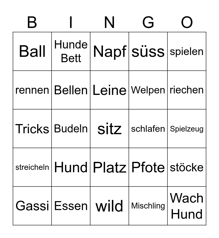 This bingo card has a free space and 24 words: Hund, Essen, Leine, Gassi, spielen, Ball, rennen, Hunde Bett, schlafen, Platz, Welpen, Tricks, Pfote, stöcke, Bellen, Mischling, Spielzeug, Napf, riechen, Budeln, Wach Hund, streicheln, süss and wild.