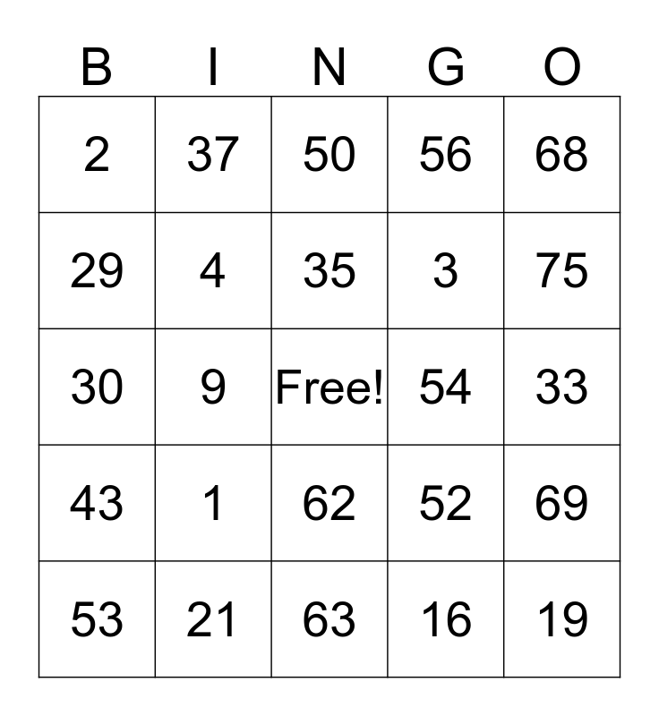 This bingo card has a free space and 24 words: 1, 21, 35, 53, 68, 2, 29, 37, 54, 62, 3, 30, 52, 69, 4, 16, 33, 50, 75, 9, 19, 43, 56 and 63.