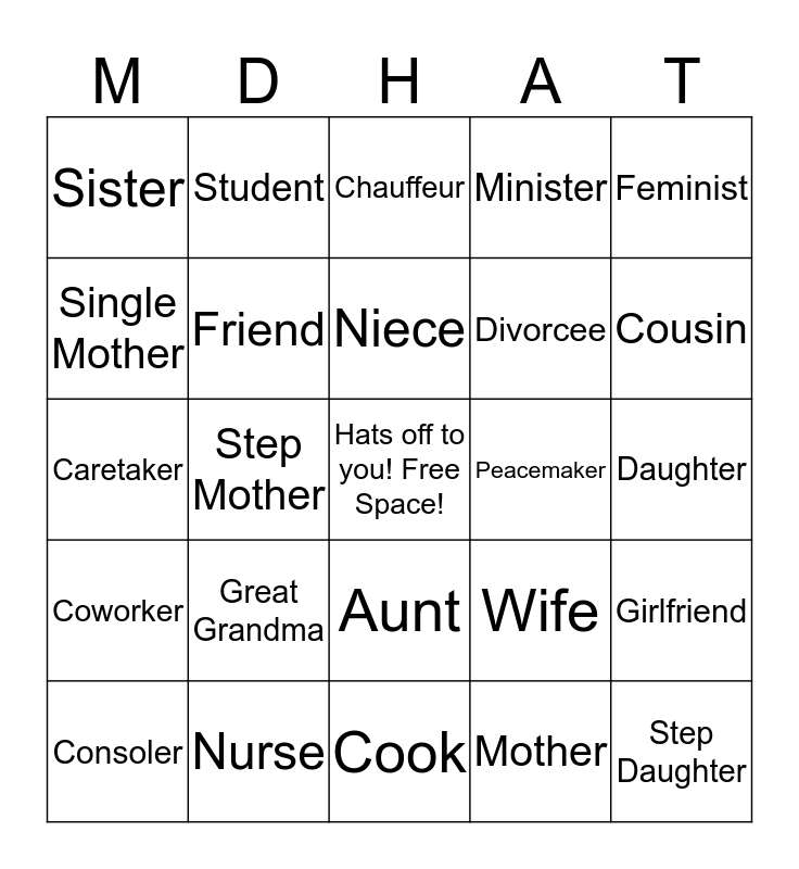 This bingo card has a free space and 28 words: Girlfriend, Widow, Divorcee, Mother, Single Mother, Chauffeur, Student, Coworker, Peacemaker, Consoler, Caretaker, Minister, Nurse, Cook, Cousin, Grandma, Great Grandma, Friend, Niece, Aunt, Sister, Teacher, Step Daughter, Step Mother, Daughter, Wife, Feminist and God Mother.