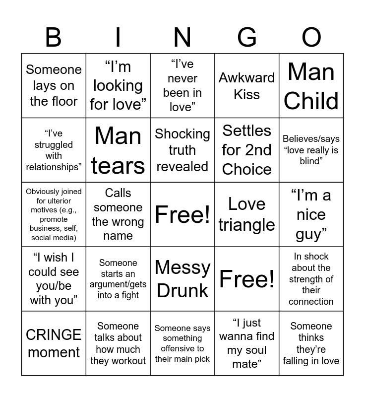 This bingo card has a free space and 25 words: Someone starts an argument/gets into a fight, Someone says something offensive to their main pick, Shocking truth revealed, CRINGE moment, Man Child, Someone lays on the floor, “I’ve struggled with relationships”, “I’m looking for love”, Love triangle, Messy Drunk, Settles for 2nd Choice, Obviously joined for ulterior motives (e.g., promote business, self, social media), Free!, In shock about the strength of their connection, Man tears, Moves closer/Touches wall, “I’m a nice guy”, “I’ve never been in love”, Believes/says “love really is blind”, Calls someone the wrong name, Someone thinks they’re falling in love, Someone talks about how much they workout, “I wish I could see you/be with you”, Awkward Kiss and “I just wanna find my soul mate”.