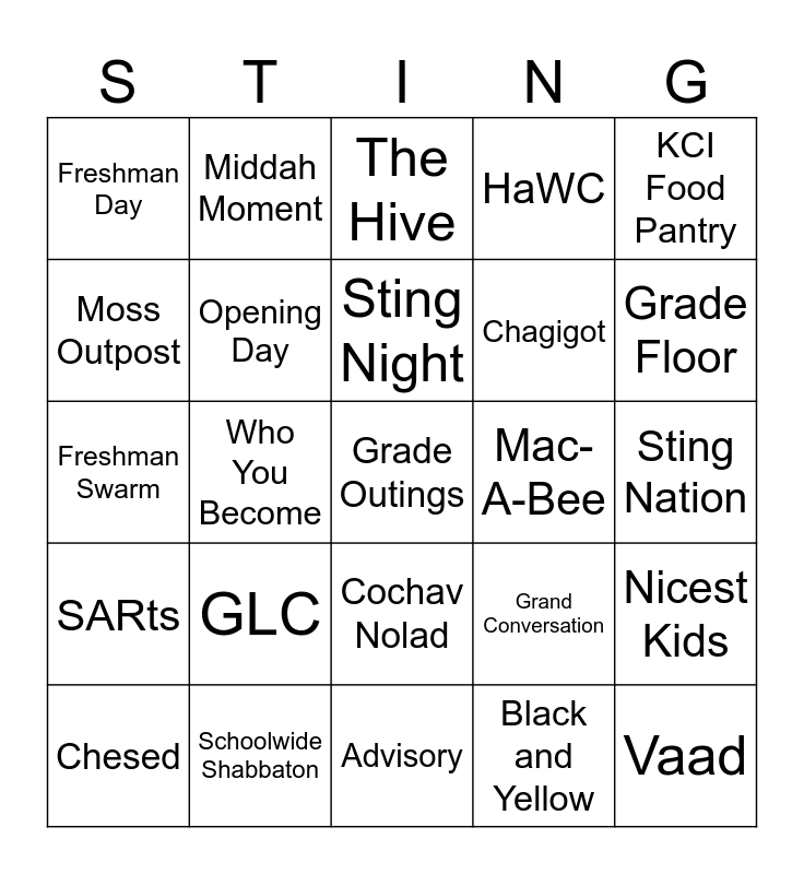 This bingo card has a free space and 24 words: GLC, Schoolwide Shabbaton, Sting Night, Chesed, KCI Food Pantry, Freshman Day, Moss Outpost, Middah Moment, Mac-A-Bee, Cochav Nolad, Chagigot, Freshman Swarm, Grand Conversation, Nicest Kids, Opening Day, Black and Yellow, Sting Nation, The Hive, Grade Floor, Who You Become, Vaad, SARts, HaWC and Advisory.