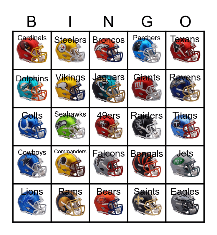 This bingo card has 31 images, a free space and 31 words: Bears, Chargers, Seahawks, Browns, Cardinals, Broncos, Vikings, Bengals, Raiders, Saints, Titans, Eagles, Patriots, Packers, Ravens, Buccaneers, Jets, Commanders, Cowboys, Falcons, Texans, Bills, Lions, Steelers, Giants, Dolphins, Panthers, Colts, Rams, Jaguars and Chiefs.
