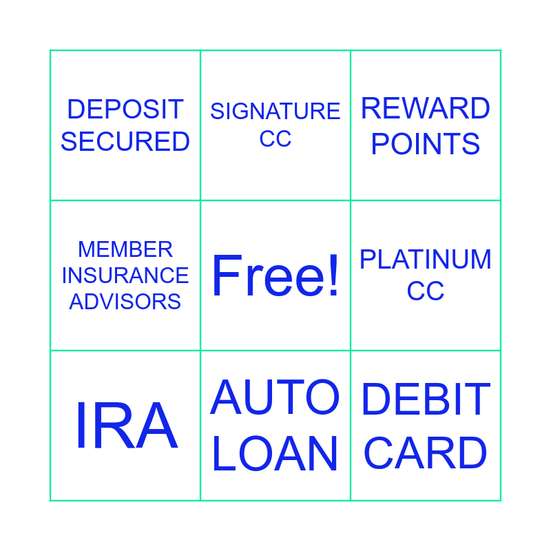 This bingo card has a free space and 12 words: CHECKING, MMA, DEBIT CARD, PLATINUM CC, SIGNATURE CC, REWARD POINTS, AUTO LOAN, DEBT CONSOLIDATION, DEPOSIT SECURED, MEMBER INSURANCE ADVISORS, IRA and CD.