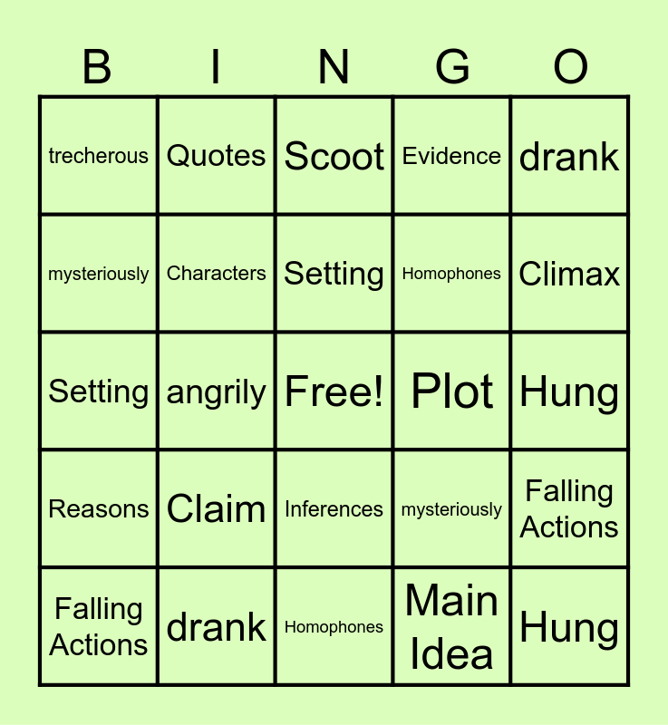This bingo card has a free space and 63 words: Exposition, Rising Actions, Climax, Falling Actions, Resolution, Main Idea, Quotes, Characters, Setting, Plot, Inferences, Context Clues, Hung, drank, swam, mysteriously, angrily, trecherous, frail, Homophones, Claim, Reasons, Evidence, Scoot, flour, petrifying, rang, Athena, Epimetheus, fire, Conflict, AltTerms, Exposition, Rising Actions, Climax, Falling Actions, Resolution, Main Idea, Quotes, Characters, Setting, Plot, Inferences, Context Clues, Hung, drank, swam, mysteriously, angrily, murderous, frail, Homophones, Claim, Reasons, Evidence, Scoot, flour, petrifying, contractions, Athena, Epimetheus, fire and Conflict.