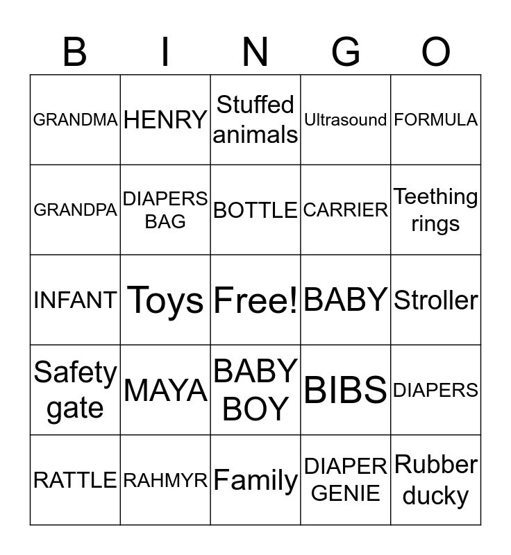 This bingo card has a free space and 24 words: MAYA, RAHMYR, BOTTLE, RATTLE, FORMULA, GRANDMA, GRANDPA, HENRY, BABY, BABY BOY, CARRIER, INFANT, BIBS, DIAPERS, DIAPERS BAG, DIAPER GENIE, Stroller, Stuffed animals, Teething rings, Toys, Rubber ducky, Safety gate, Ultrasound and Family.