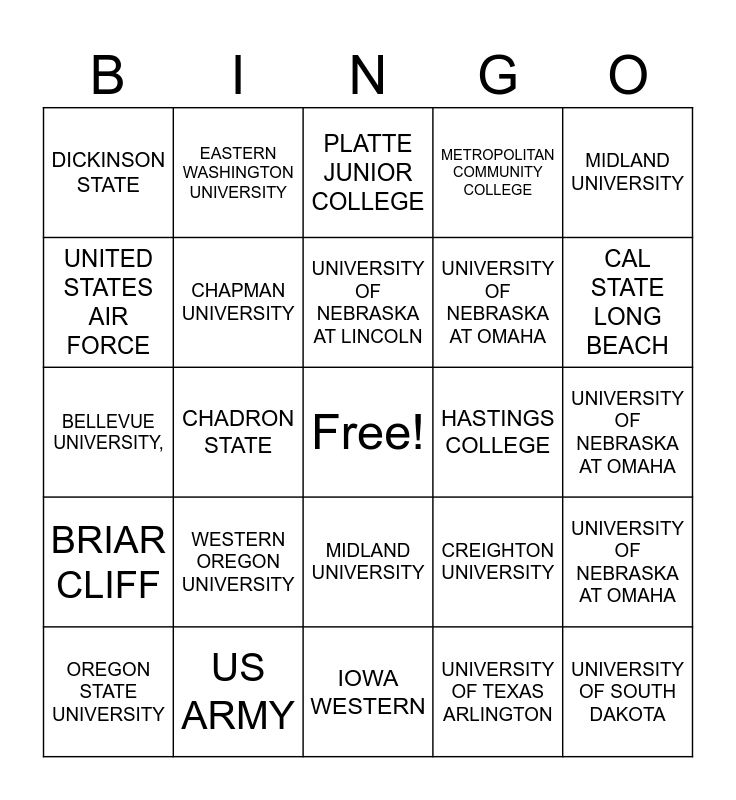 This bingo card has a free space and 63 words: BELLEVUE UNIVERSITY, CONCORDIA UNIVERSITY, PERU STATE, UNIVERSITY OF NEBRASKA AT OMAHA, BELLEVUE UNIVERSITY, PERU STATE, EASTERN WASHINGTON UNIVERSITY, NORTHWEST MISSISSIPPI COMMUNITY COLLEGE, UNIVERSITY OF NEBRASKA AT LINCOLN, UNIVERSITY OF NEBRASKA AT OMAHA, MIDLAND UNIVERSITY, UNIVERSITY OF NEBRASKA AT LINCOLN, UNIVERSITY OF NEBRASKA AT OMAHA, MIDLAND UNIVERSITY, VATEROTT COLLEGE, UNITED STATES AIR FORCE, CHADRON STATE, DICKINSON STATE, LORAS COLLEGE, UNIVERSITY OF NEBRASKA AT OMAHA, WESTERN OREGON UNIVERSITY, BRIAR CLIFF, METROPOLITAN COMMUNITY COLLEGE, NORTHWESTERN COLLEGE, PERU STATE, WAYNE STATE, UNIVERSITY OF NEBRASKA AT LINCOLN, WESTERN GOVERNORS UNIVERSITY, AVERETT UNIVERSITY, UNIVERSITY OF PHOENIX, COLLEGE OF ST MARY'S, NEBRASKA WESLEYAN, DOANE, UNIVERSITY OF NEBRASKA AT KEARNEY, CAL STATE LONG BEACH, OREGON STATE UNIVERSITY, NORTHWEST MISSOURI STATE, UNIVERSITY OF TEXAS ARLINGTON, WASHINGTON UNIVERSITY, ST LOUIS, CHAPMAN UNIVERSITY, BELLEVUE UNIVERSITY,, HASTINGS COLLEGE, METROPOLITAN COMMUNITY COLLEGE, DE ANZA COLLEGE,, UNIVERSITY OF SOUTH DAKOTA, US ARMY, UNIVERSITY OF MISSOUR, CREIGHTON UNIVERSITY, DANA, CONCORDIA, MOUNT MARTY, IOWA WESTERN, DAKOTA WESLEYAN, SOUTH DAKOTA STATE, UNIVERSITY OF NORTHERN IOWA, PLATTE JUNIOR COLLEGE, SOUTHEAST MISSOURI STATE, ROCKHURST, OMAHA SCHOOL OF MASSAGE THERAPY, WESTERN NEBRASKA COMMUNITY COLLEGE, UNIVERSITY OF KANSAS, CORNELL COLLEGE and COLORADO CHRISTIAN UNIVERSITY.