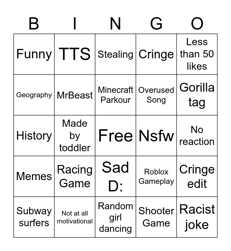This bingo card has a free space and 36 words: Skit/Sketch, Anything Food Related, Over 1M likes, MrBeast, Roblox Gameplay, Memes, Minecraft Parkour, Reddit story, Less than 50 likes, Something really interesting, Made by toddler, Cringe, Word by word text, Nsfw, Gorilla tag, Funny, Gay, Racing Game, Racist joke, Stealing, No reaction, Cringe edit, Not at all motivational, Subway surfers, Random girl dancing, TTS, History, The word "rizz", Overused Song, Geography, "💀", Wholesome, Shooter Game, Sad D:, Low quality and Bad Loop.