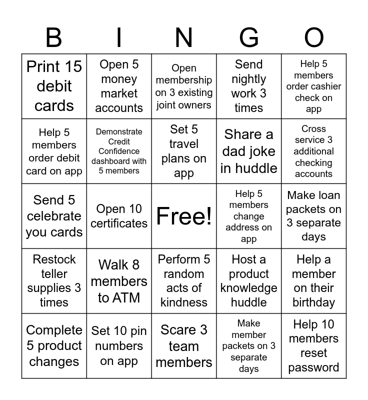 This bingo card has a free space and 24 words: Walk 8 members to ATM, Set 10 pin numbers on app, Set 5 travel plans on app, Complete 5 product changes, Help 5 members order cashier check on app, Print 15 debit cards, Help 5 members order debit card on app, Open 5 money market accounts, Help 5 members change address on app, Perform 5 random acts of kindness, Share a dad joke in huddle, Send 5 celebrate you cards, Host a product knowledge huddle, Help a member on their birthday, Demonstrate Credit Confidence dashboard with 5 members, Make member packets on 3 separate days, Make loan packets on 3 separate days, Open membership on 3 existing joint owners, Cross service 3 additional checking accounts, Open 10 certificates, Help 10 members reset password, Restock teller supplies 3 times, Send nightly work 3 times and Scare 3 team members.