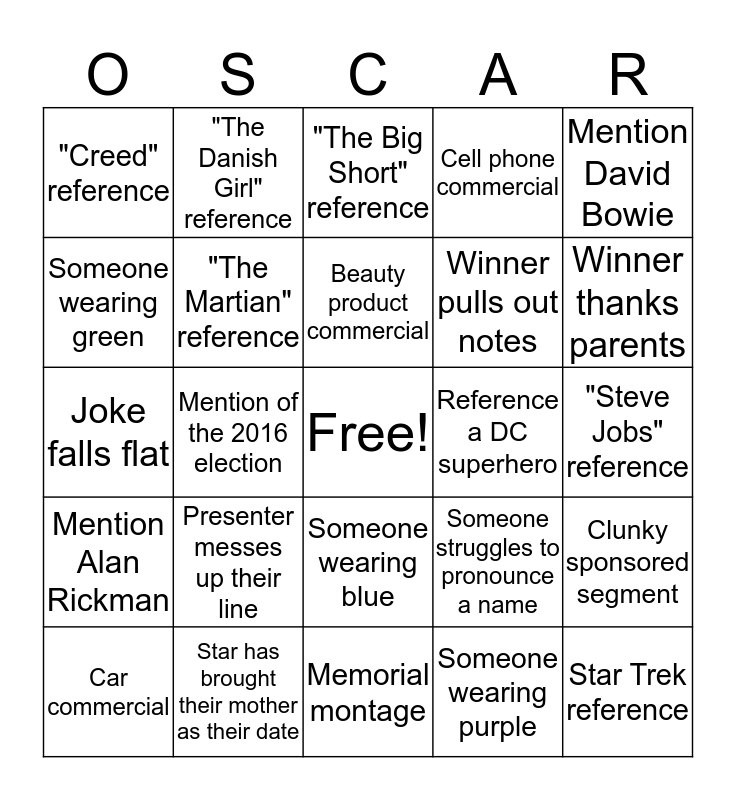 This bingo card has a free space and 24 words: Presenter messes up their line, Star has brought their mother as their date, Beauty product commercial, Car commercial, Mention David Bowie, "Creed" reference, Someone wearing green, "The Danish Girl" reference, Reference a DC superhero, Someone wearing blue, Winner pulls out notes, Joke falls flat, Someone struggles to pronounce a name, Clunky sponsored segment, "The Martian" reference, Someone wearing purple, "Steve Jobs" reference, "The Big Short" reference, Winner thanks parents, Mention of the 2016 election, Star Trek reference, Mention Alan Rickman, Cell phone commercial and Memorial montage.