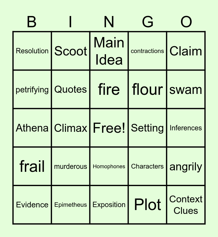 This bingo card has a free space and 31 words: Exposition, Rising Actions, Climax, Falling Actions, Resolution, Main Idea, Quotes, Characters, Setting, Plot, Inferences, Context Clues, Hung, drank, swam, mysteriously, angrily, murderous, frail, Homophones, Claim, Reasons, Evidence, Scoot, flour, petrifying, contractions, Athena, Epimetheus, fire and Conflict.