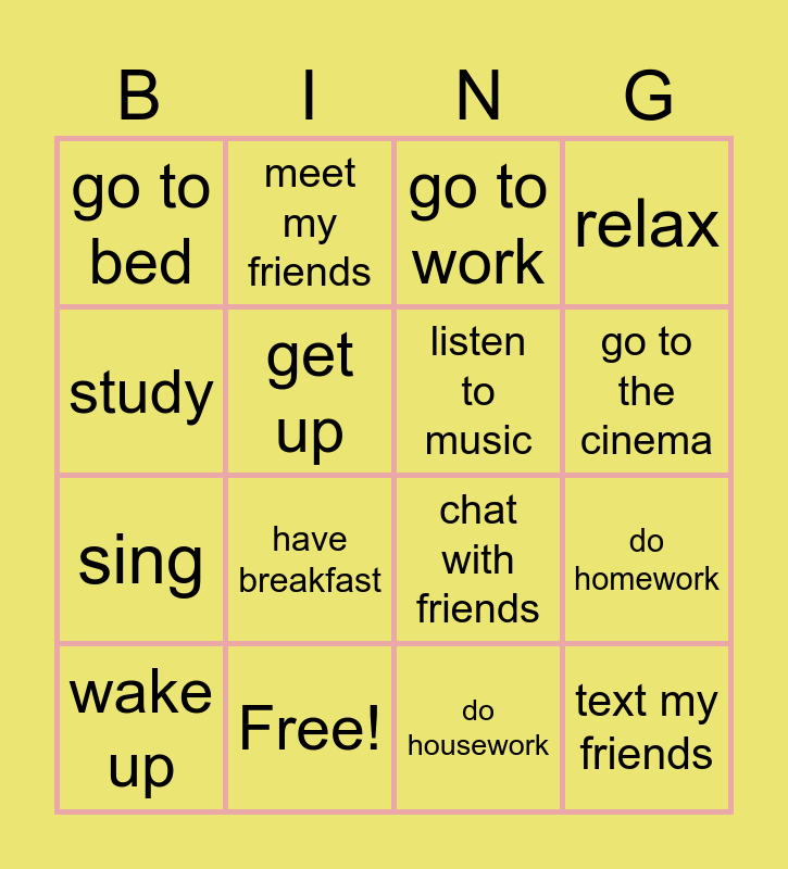 This bingo card has 28 words: run, swim, sing, go to school, get up, go to work, meet my friends, text my friends, Free!, cry, chat with friends, relax, check emails, have a shower, have breakfast, go home, go shopping, listen to music, go to the cinema, listen to the radio, go to bed, fall asleep, wake up, do homework, do housework, do experiments, study and shout.