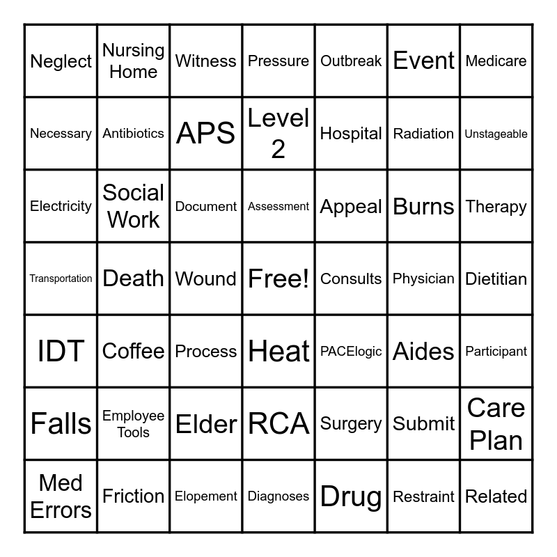 This bingo card has a free space and 63 words: Fracture, Dietitian, Quality, Burns, Process, Med Errors, Nursing Home, Case Manager, Necessary, Friction, Assessment, Surgery, Electricity, Outbreak, Unexpected, Event, Hospital, Neglect, Injury, Antibiotics, Document, Social Work, Pressure, Coffee, Grievance, Aides, Heat, Services, Physician, Falls, Chemicals, RCA, Occurrence, Mad, APS, Therapy, Submit, Wound, Participant, Medicare, Level 2, Unstageable, Care Plan, CMS, Radiation, Transportation, Related, Appeal, Elopement, Drug, Restraint, Death, IDT, PACE, Adverse, Witness, Elder, PACElogic, Employee Tools, Diagnoses, Policy, Consults and Emergency.