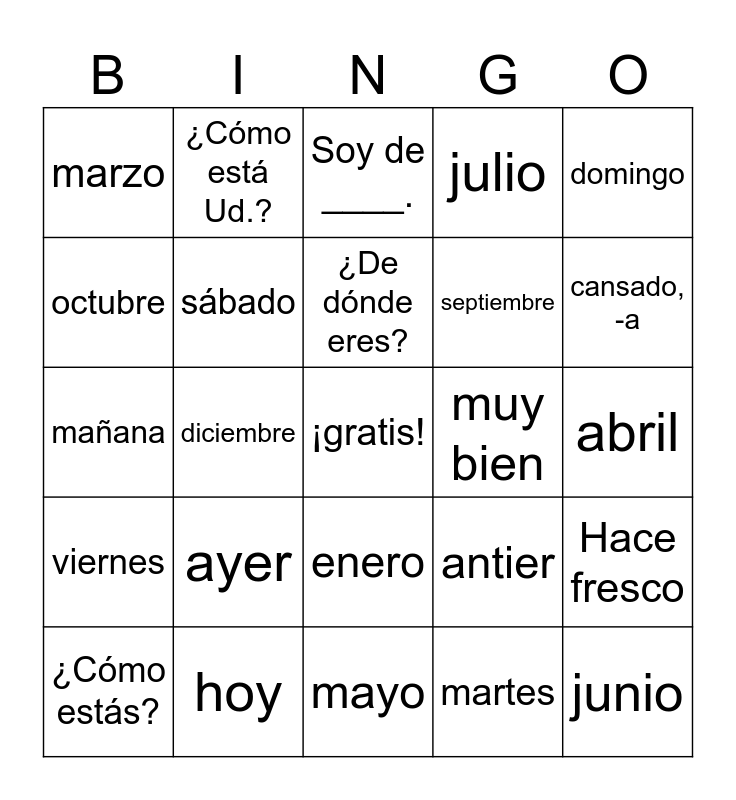 This bingo card has a free space and 34 words: lunes, martes, miércoles, jueves, viernes, sábado, domingo, ¿Cómo estás?, ¿Cómo está Ud.?, ¿Cómo te llamas?, ¿De dónde eres?, Soy de ____., regular, mal, muy bien, cansado, -a, hoy, mañana, ayer, antier, enero, febrero, marzo, abril, mayo, junio, julio, agosto, septiembre, octubre, noviembre, diciembre, Hace fresco and Hace sol.