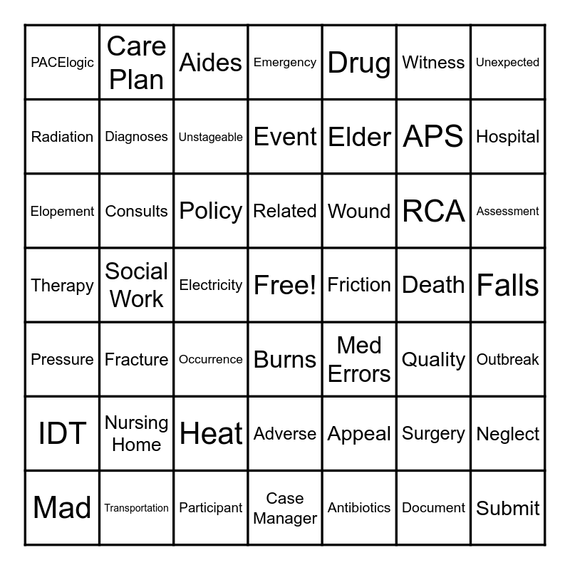 This bingo card has a free space and 63 words: Physician, Falls, Chemicals, RCA, Occurrence, Mad, Care Plan, CMS, Radiation, Transportation, Related, Appeal, Elopement, Drug, Restraint, Witness, Elder, PACElogic, Employee Tools, Diagnoses, Policy, Consults, Emergency, Fracture, Dietitian, Quality, Burns, Process, Death, IDT, PACE, Adverse, Medicare, Level 2, Unstageable, Assessment, Surgery, Electricity, Outbreak, Unexpected, Event, Hospital, Neglect, Injury, APS, Therapy, Submit, Wound, Participant, Antibiotics, Document, Social Work, Pressure, Coffee, Grievance, Aides, Heat, Med Errors, Nursing Home, Case Manager, Necessary, Friction and Services.