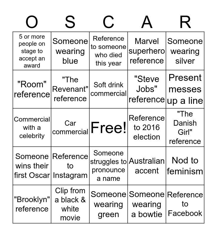 This bingo card has a free space and 24 words: Reference to Instagram, Clip from a black & white movie, Soft drink commercial, "Brooklyn" reference, Someone wearing silver, 5 or more people on stage to accept an award, "Room" reference, Someone wearing blue, Reference to 2016 election, Someone struggles to pronounce a name, "Steve Jobs" reference, Commercial with a celebrity, Australian accent, Nod to feminism, "The Revenant" reference, Someone wearing a bowtie, "The Danish Girl" reference, Reference to someone who died this year, Present messes up a line, Car commercial, Reference to Facebook, Someone wins their first Oscar, Marvel superhero reference and Someone wearing green.