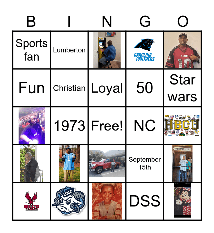 This bingo card has 13 images, a free space and 11 words: Loyal, DSS, Sports fan, Lumberton, NC, Christian, September 15th, Fun, Star wars, 1973 and 50.