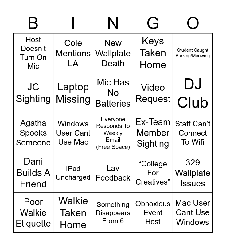 This bingo card has a free space and 28 words: 329 Wallplate Issues, 429 Wallplate Issues, Video Request, Obnoxious Event Host, JC Sighting, New Wallplate Death, Cole Mentions LA, Dani Builds A Friend, Ex-Team Member Sighting, Poor Walkie Etiquette, Agatha Spooks Someone, Keys Taken Home, Walkie Taken Home, Something Disappears From 6, DJ Club, Last Minute Tech Request, IPad Uncharged, Laptop Missing, Mic Has No Batteries, Lav Feedback, Host Doesn’t Turn On Mic, Missing Clicker, Mac User Cant Use Windows, Windows User Cant Use Mac, Staff Can’t Connect To Wifi, “College For Creatives”, Student Caught Barking/Meowing and Security Not Doing Their Job.